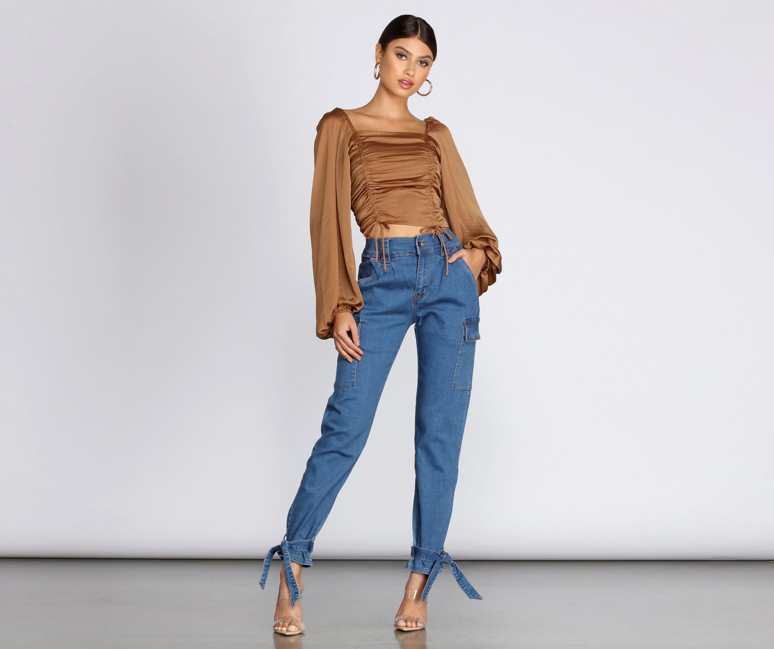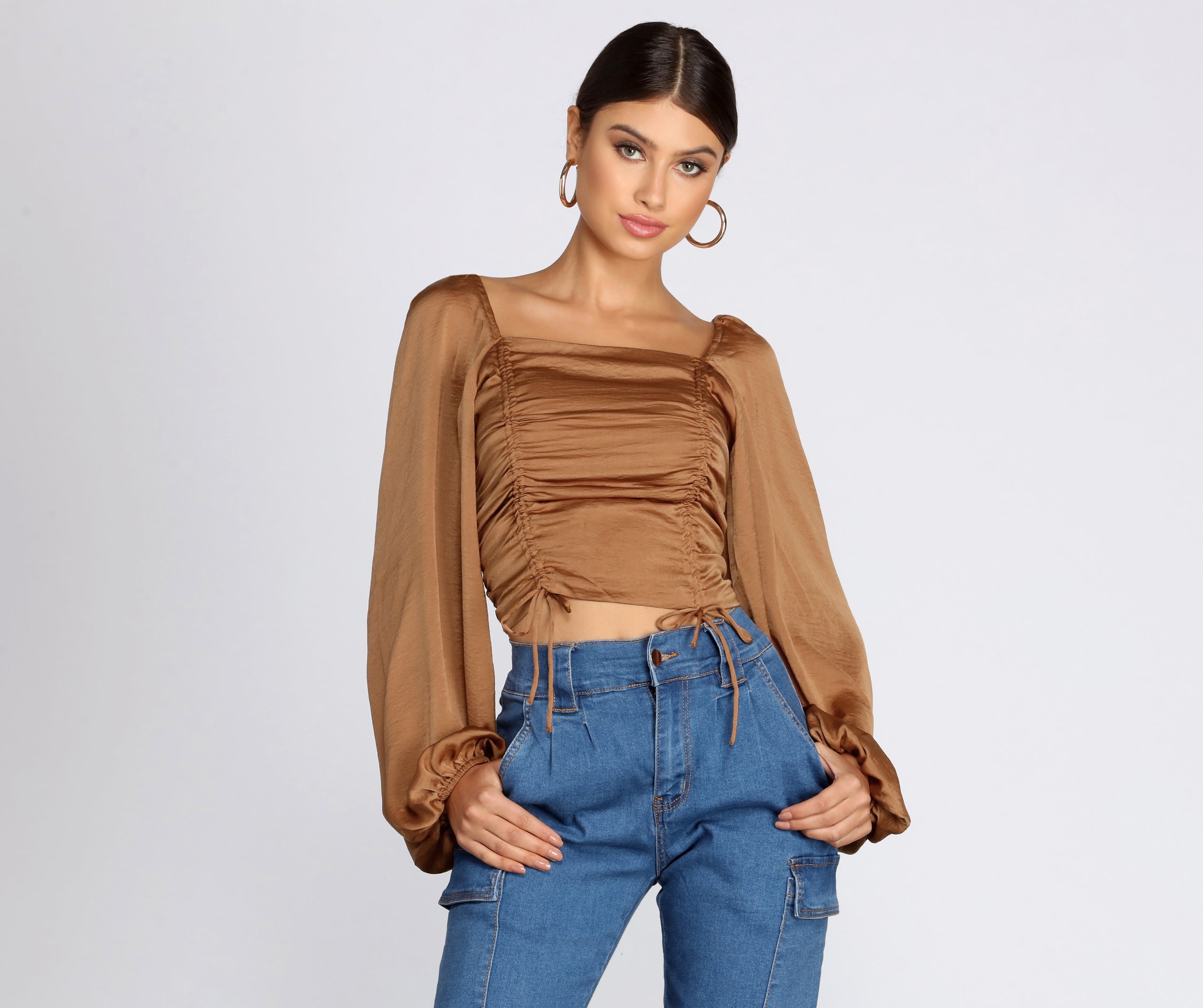 Dress up your everyday fall look with this adorable satin smocked blouse! It features long billowy sleeves with elastic banded cuffs, a square neck and back, a stretchy smocked back, ruched detailing down the front with dual drawstrings, and a cropped hem. The satin-like fabric has no stretch.