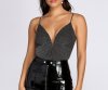 Let all your former bodysuits go, because this glow-worthy piece is the one for you! It featues a sleeveless bodice, adjustable spaghetti straps, a wired plunging V neckline with center ruched detailing, a square back, and a thong bottom with dual snap button closures. The metallic knit fabric offers a form hugging fit and an ample amount of stretch.