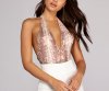 Its time to level up your look! This bodysuit has a deep v neckline, a halter top strap, and a low open back line. The bottom of the suit is a thong style with high rise sides, and double snap-button closure at crotch. Composed of a polyester material, and 100% covered in stitched sequins. This bodysuit offers a form fit with moderate stretch.