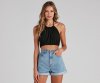 A halter crop top like this is always needed for day or night fun! It features a sleeveless, halter neck with dual tie-back closures, a cropped hem, and an open-back design. Composed of stretchy rib-knit fabric. Style with
