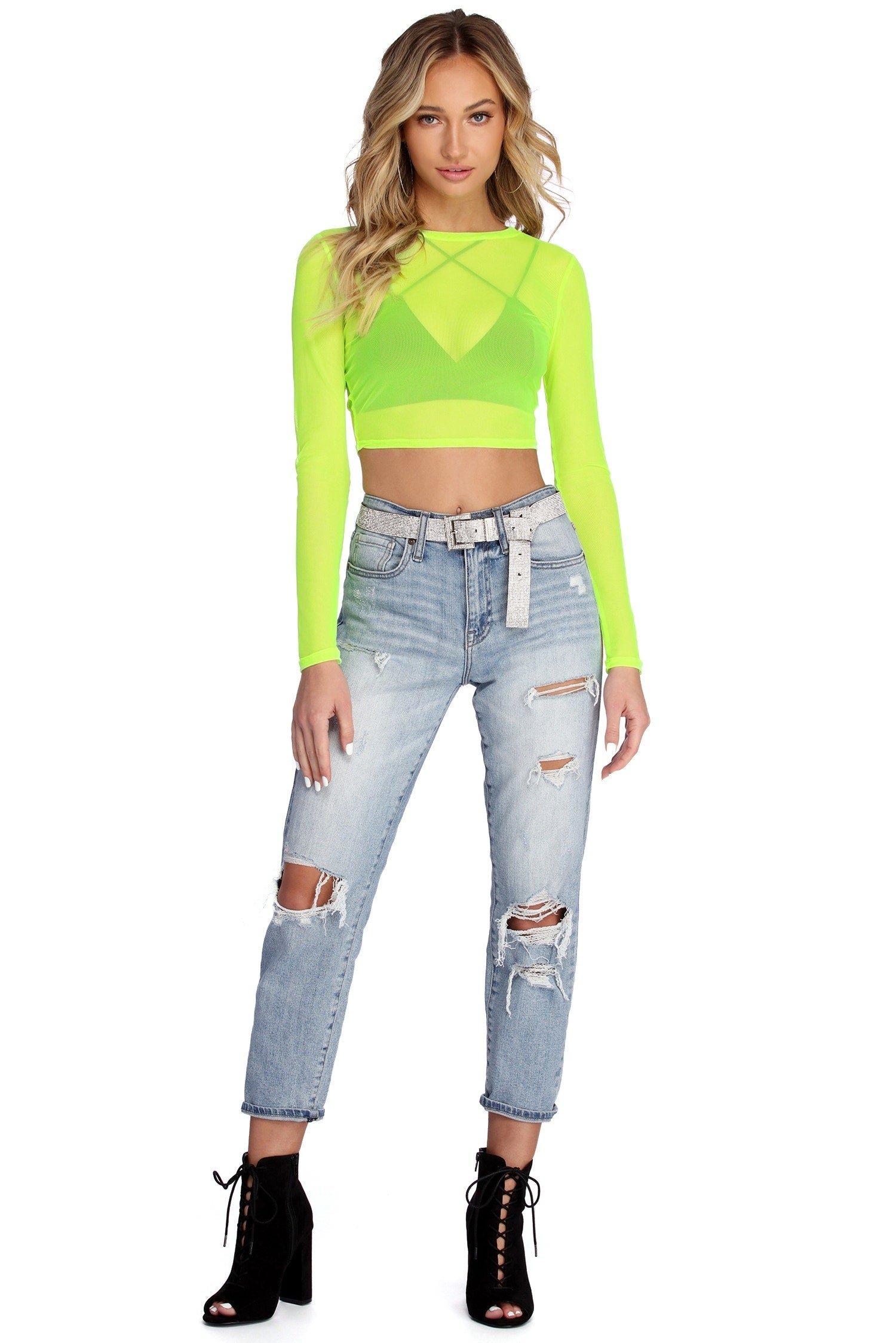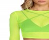 You only mess with the best style! This fab crop top features a round neck, long fitted sleeves, and a cropped hem. The bright neon yellow top is composed of a sheer and stretchy mesh fabric with a form hugging style. Bralette not included with garment.